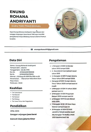 Nama Saya Enung Rohana Andriyanti , Saya Seorang Guru Tari Tradisional, lulusan dari Sanggar Anjungan Jawa Barat TMII dan memiliki pengalaman 9 tahun terakhir di Beberapa Sekolah SD , SMP dan SMK yang ada di Jakarta.